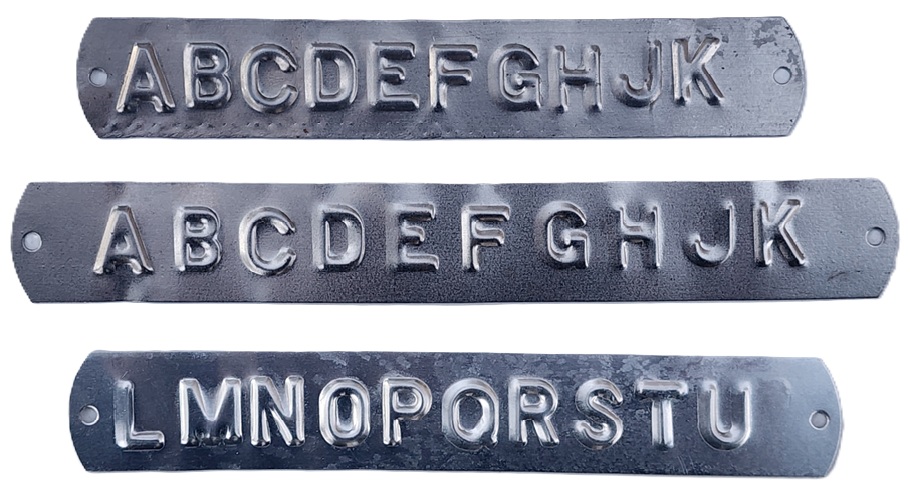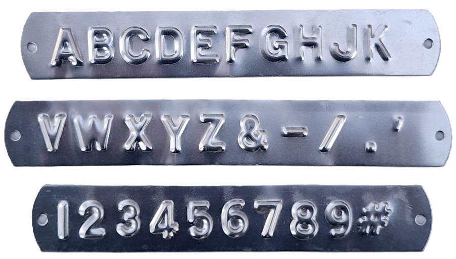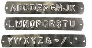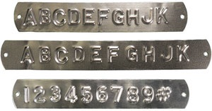 Embossing tapes are available in a variety of materials. Aluminum, brass, stainless steel, cold rolled steel and zinc. 5/16"; 1/2"; 7/8".